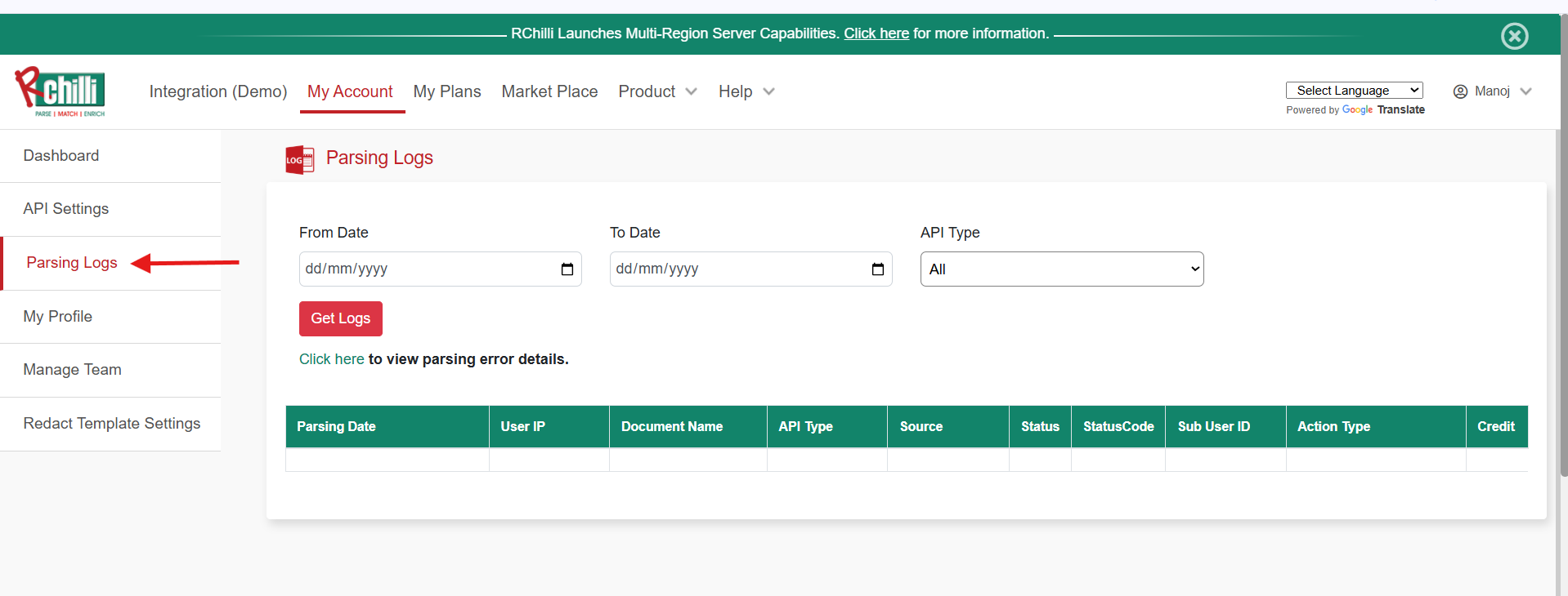 To check for your Parsing Logs or Usage, Please follow the below-mentioned steps: