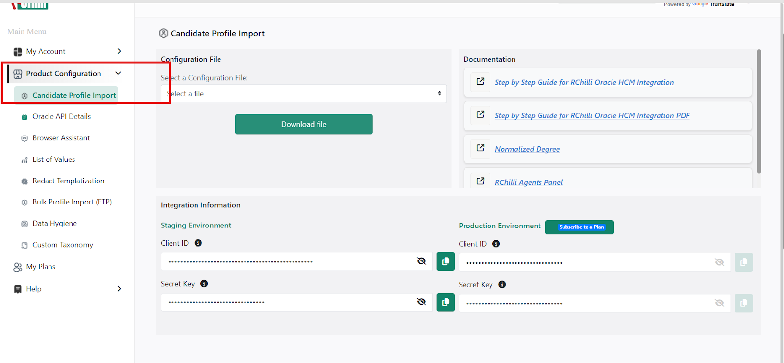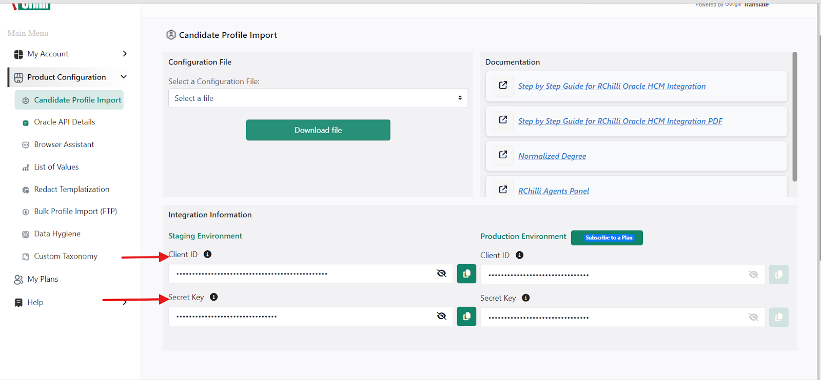 The Client ID and Secret Key for agent authentication in Oracle Recruiting Cloud are unique to each client and can be retrieved from the "My Account" section of the RChilli portal.