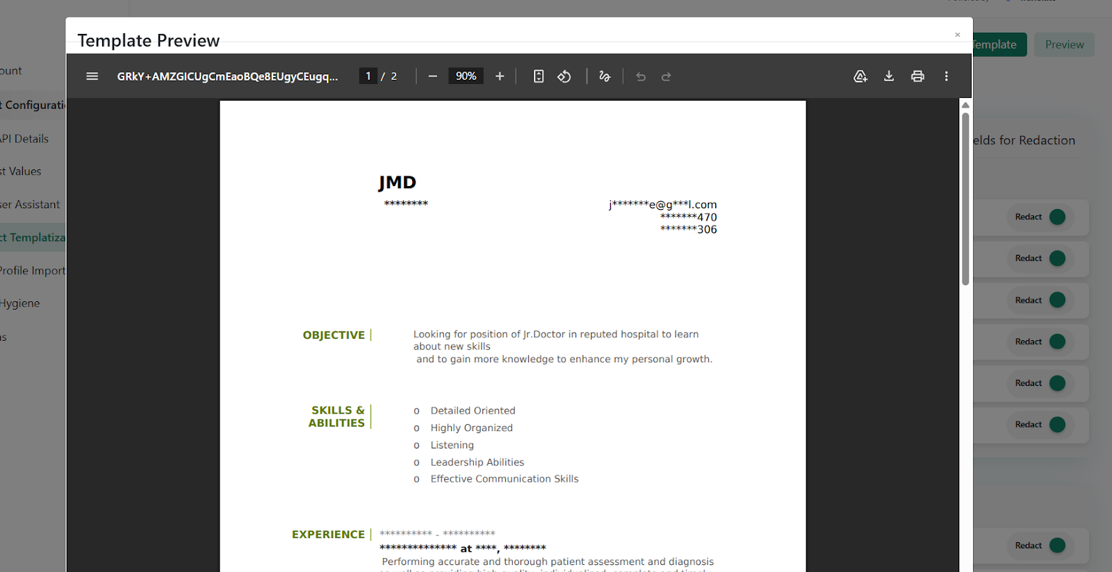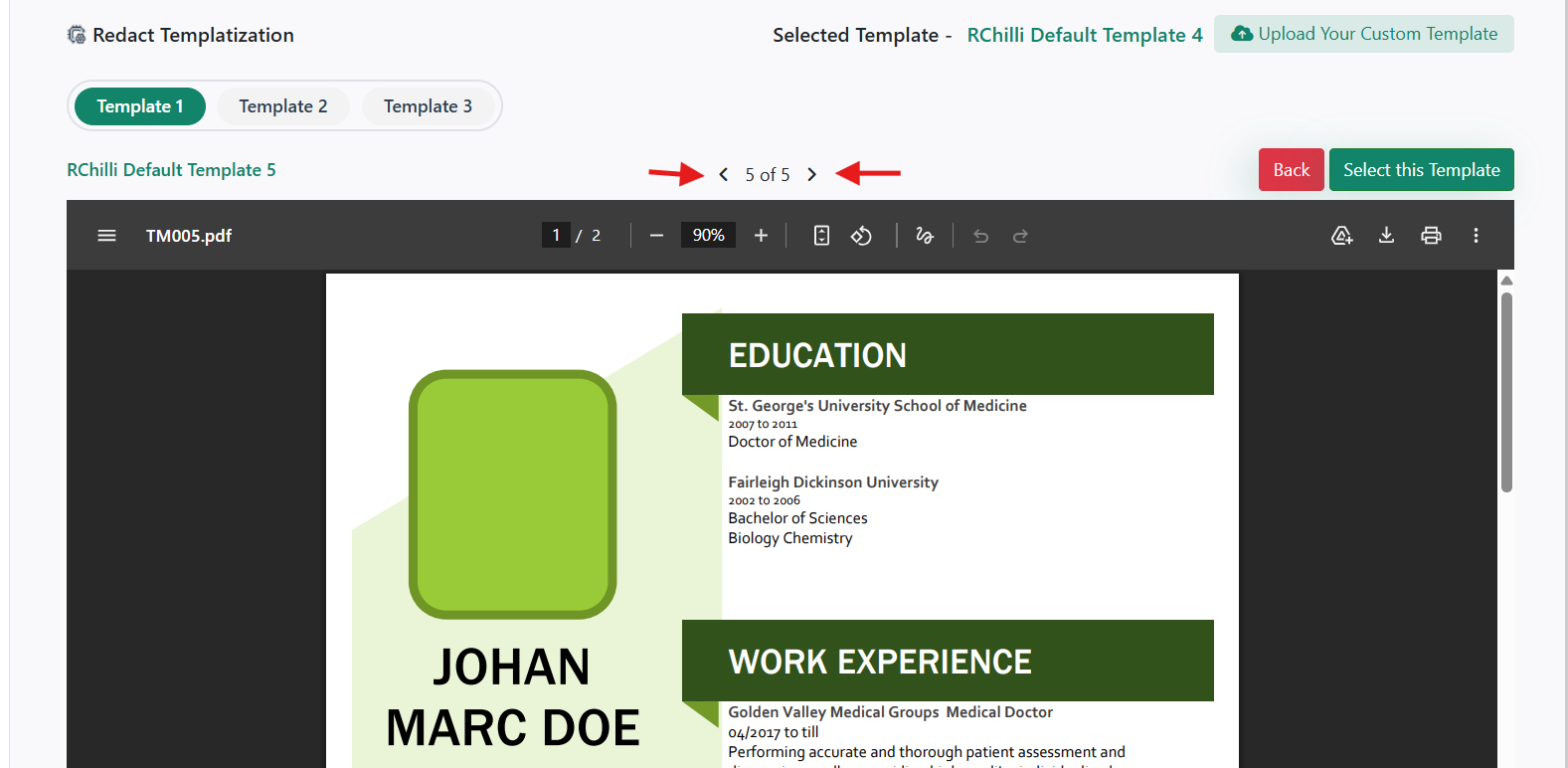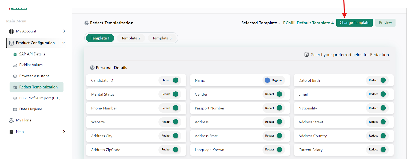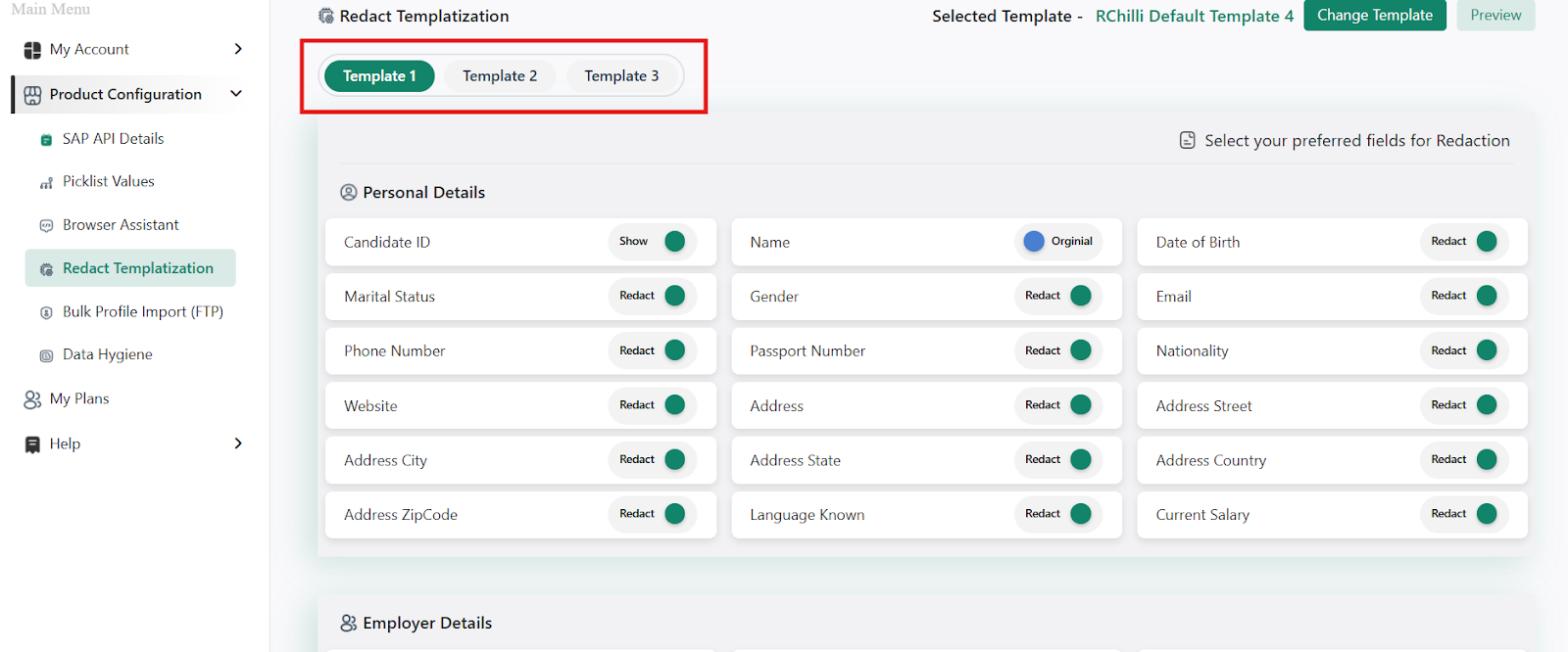 A Redact Template can be selected from the available RChilli templates or from a custom uploaded template.